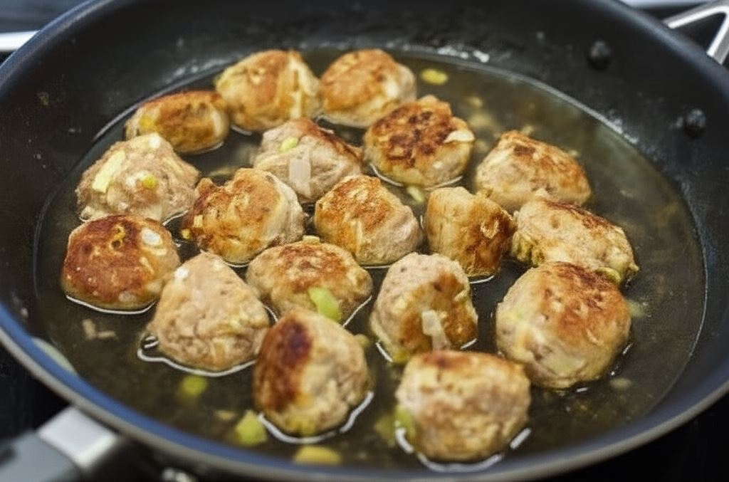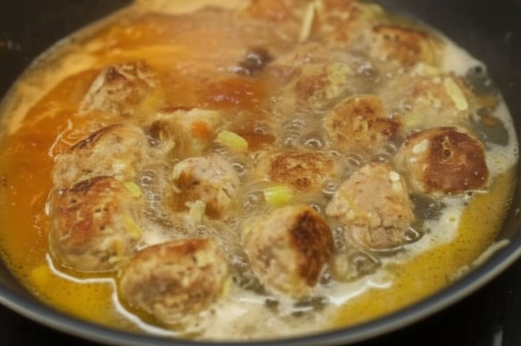 Uformuj z mięsa niewielkie kulki. Obtocz je w mące, po czym obsmaż na rozgrzanym oleju. Zalej wszystko szklanką wody i gotuj przez około 10 minut, aż woda odparuje do połowy.