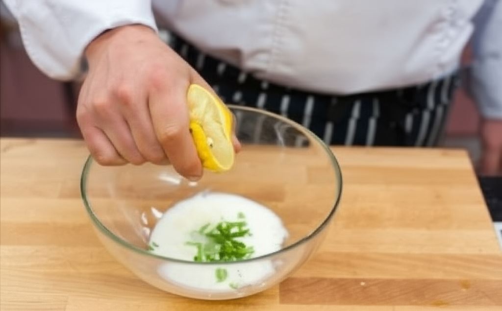 Jogurt połącz z utartą skórką cytryny, wyciśniętym sokiem oraz posiekaną miętą.