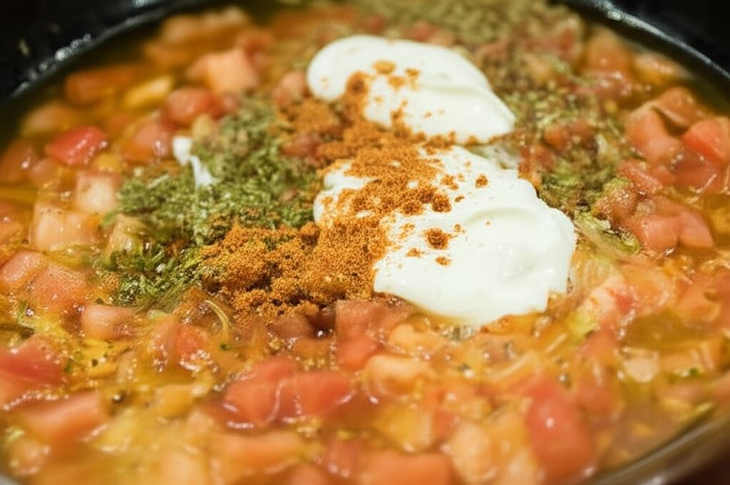 Do tej samej patelni dodaj pokrojone pomidory, wodę, jogurt i resztę zawartości opakowania Knorr Naturalnie Smaczne. Zamieszaj i gotuj na niskim ogniu przez 3-4 minuty. Przypraw oregano i majerankiem.