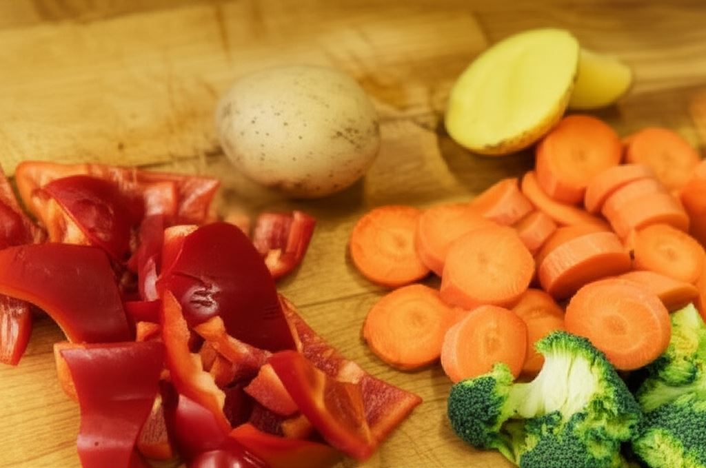 W tym czasie przygotuj warzywa. Czerwoną paprykę potnij na większe kawałki. Brokuła podziel na małe różyczki, marchewkę pokrój w grubsze krążki, ziemniaki na ćwiartki.