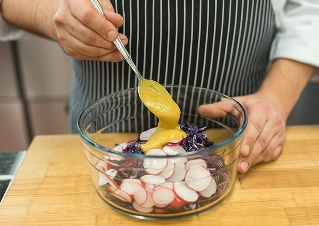 Sporządź sałatkę. Do obszernej miski wsyp poszatkowaną kapustę i pokrojoną na plasterki rzodkiewkę. Dopraw musztardą miodową. Skrop olejem. Zamieszaj ręką, delikatnie ugniatając kapustę w dłoniach. Potem odstaw na około 10-15 minut, by aromaty się przeniknęły. Serwuj z pulpecikami.