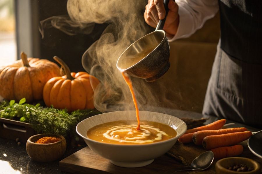 Profesjonalne wykończenie zupy krem z dyni wymaga precyzji i znajomości zasad food designu. Spirala z kwaśnej śmietany wykonana przy pomocy butelki z dozownikiem tworzy elegancki wzór, który można delikatnie „przeciągnąć” wykałaczką, tworząc marmurkowaty efekt. Olej z pestek dyni aplikowany kropelkowo nadaje nie tylko intensywny aromat, ale także głęboki, szmaragdowy kolor kontrastujący z pomarańczową zupą.