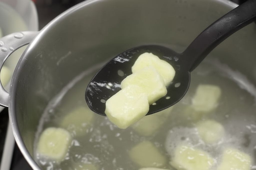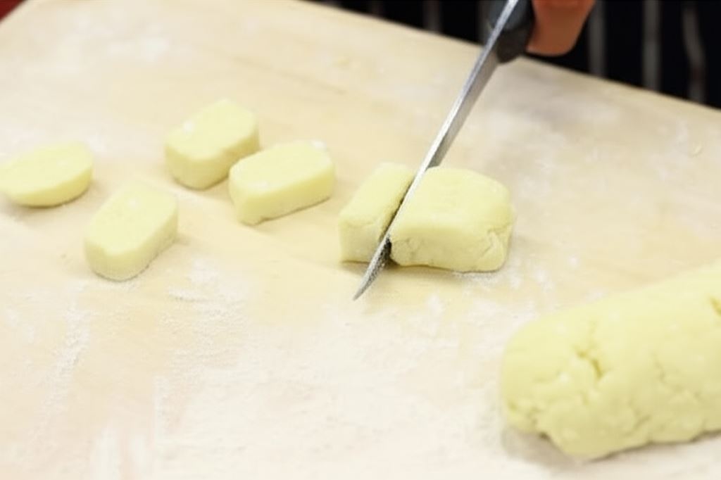 Kawałki ciasta potnij nożem w romby i gotuj w wodzie przez 2-3 minuty