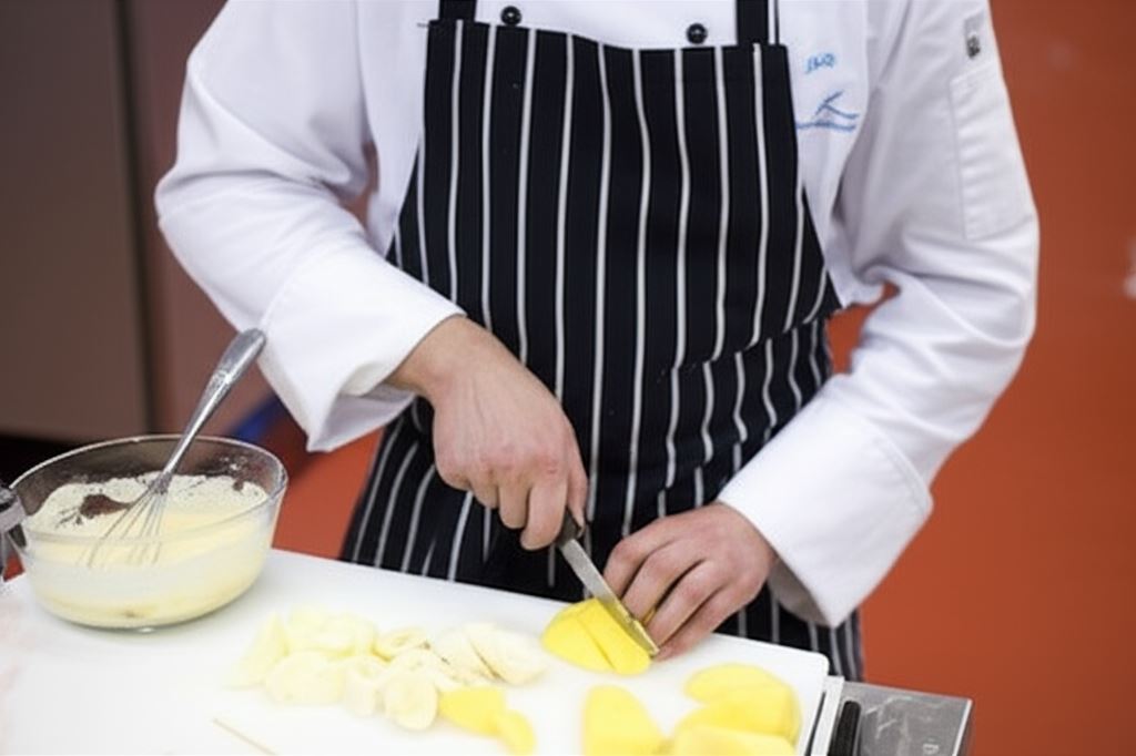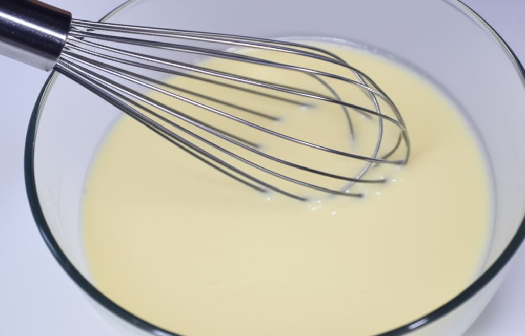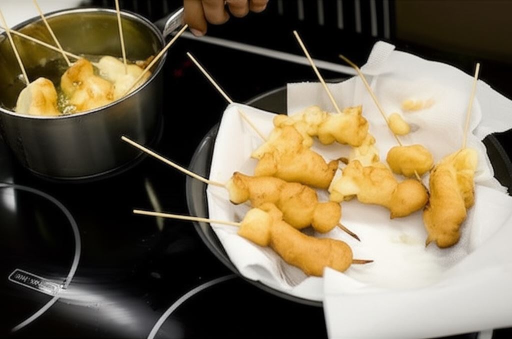 Owoce zanurzaj w gęstym cieście i smażaj na złoty kolor w głębokim tłuszczu.