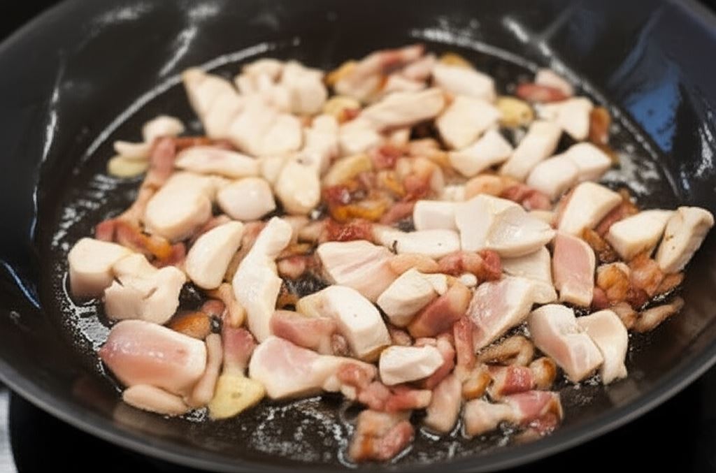 Boczek pokrój w kosteczkę. Na patelni podgrzej kilka łyżek oleju, zrumień czosnek, boczek, kiedy się lekko przesmażą dodaj piersi kurczaka pocięte w cienkie paski.