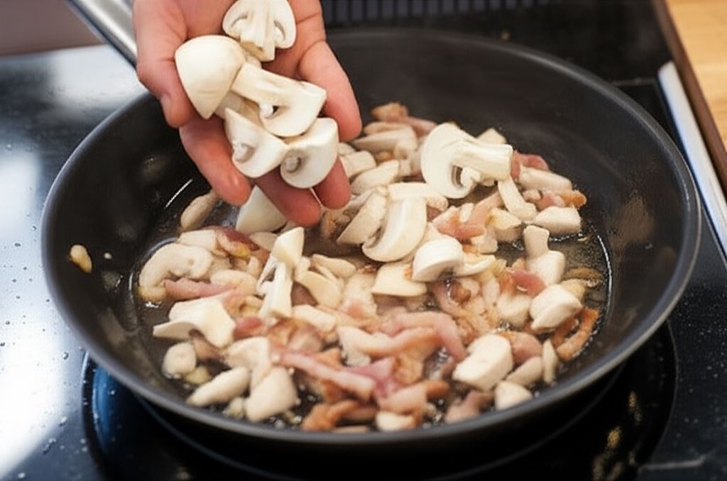 Smaż to wszystko przez pewien czas, po czym wsyp pieczarki pocięte na ćwiartki, smaż dopóki nie odparuje z nich woda.