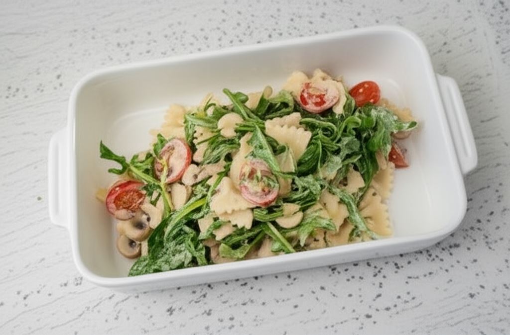 Sekret tej zapiekanki tkwi w makaronie al dente, który zachowuje swoją strukturę podczas zapiekania. Rukola dodana do gorącego sosu lekko więdnie, zachowując swój charakterystyczny, lekko orzechowy smak, który doskonale komponuje się z kremowym sosem i serem.