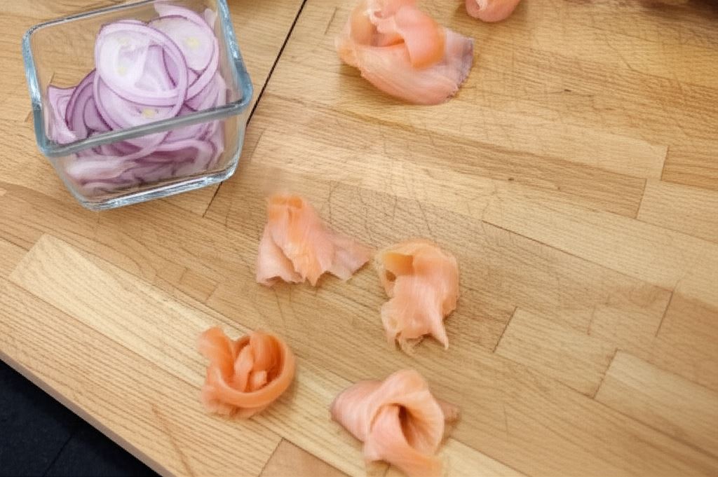 Kawałki łososia podziel na mniejsze części i uformuj małe różyczki. Cebulę posiekaj w cienkie krążki i rozdziel je na części.