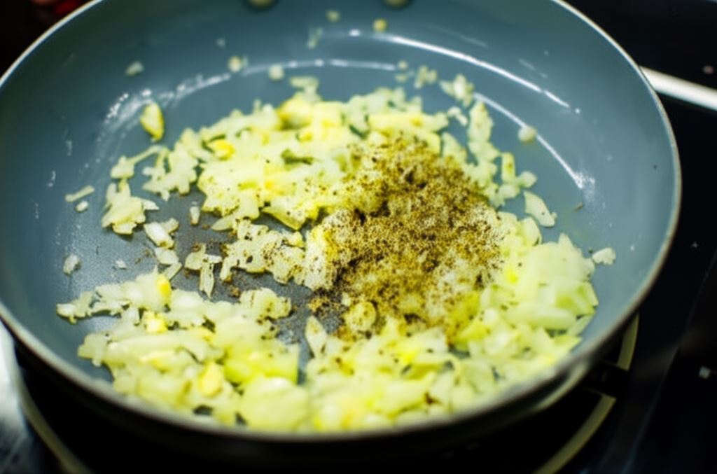Na patelni zrumień posiekaną cebulę i czosnek. Po chwili wsyp majeranek Knorr, następnie połącz całość z farszem z kapusty. Starannie wymieszaj i duś jeszcze parę minut. Przygotowany farsz odstaw do wystygnięcia.