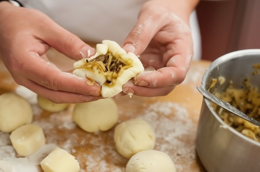 Każdą porcję ciasta uformuj w dłoniach w niewielką kulkę, w której potem umieść porcję farszu z kapusty. Kulkę ponownie ukształtuj tak, by ciasto całkowicie otuliło farsz. Przygotowane kulki odstaw na parę minut, aby przeschły.