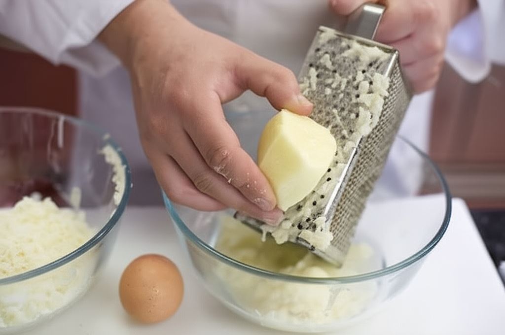 Obierz ziemniaki – połowę ugotuj, ostudź i przepuść przez praskę. Resztę ziemniaków zetrzyj na tarce z drobnymi oczkami, odciśnij. Uzyskany płyn odstaw na kilka minut w miseczce, potem zlej, a skrobię pozostałą na dnie zachowaj.