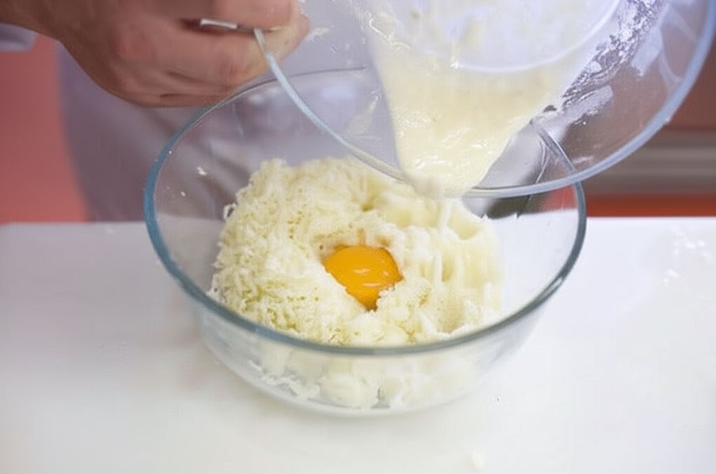 Wymieszaj w miseczce obydwa typy ziemniaków, wsyp jajko i skrobię, a następnie wyrób ciasto.