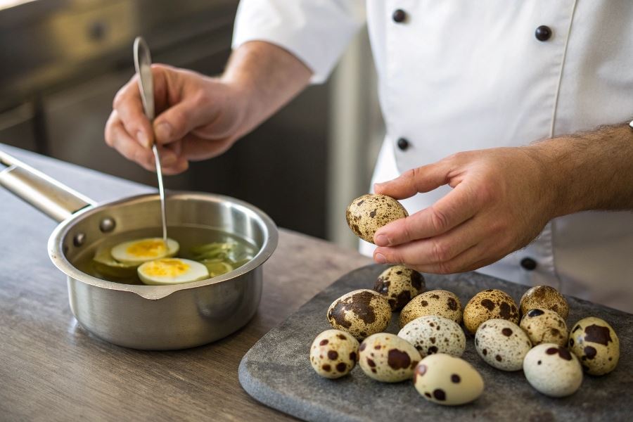 Wskazówka eksperta: Zawsze dodawaj jajka przepiórcze do już wrzącej wody – nigdy nie rozpoczynaj gotowania w zimnej wodzie, gdyż utrudni to precyzyjne określenie czasu gotowania.