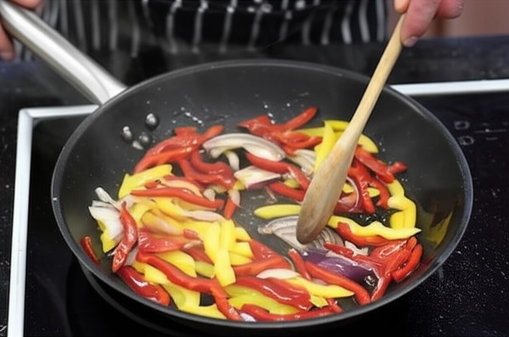 Papryki starannie opłucz, osusz, przekrój na połowy, wyciągnij nasiona i pokrój w paski równej długości. Cebulę posiekaj w cienkie piórka. Na patelnię dodaj niewielką ilość oleju roślinnego. Kiedy tłuszcz się dobrze nagrzeje, dodaj paprykę z cebulą i mieszając regularnie, podsmażaj do momentu, gdy warzywa nieco zmiękną. W tym czasie drobno posiekaj natkę kolendry, a ser żółty zetrzyj na tarce o średnich oczkach.