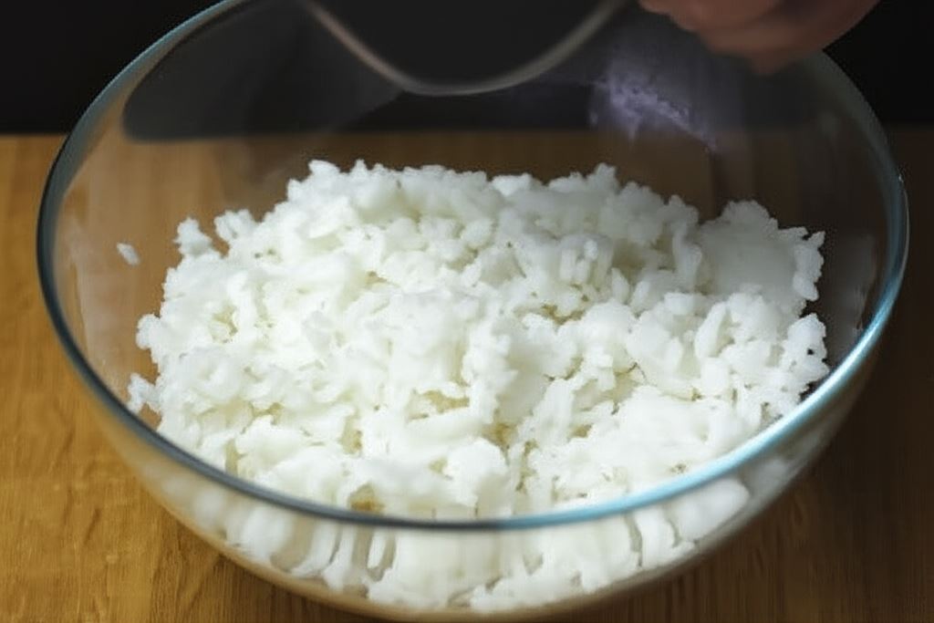 Ryż ugotuj aż będzie miękki – dopuszczalne jest nawet lekkie rozgotowanie. Ostudź, a do schłodzonego ryżu wsyp jedno jajko i starannie wymieszaj.