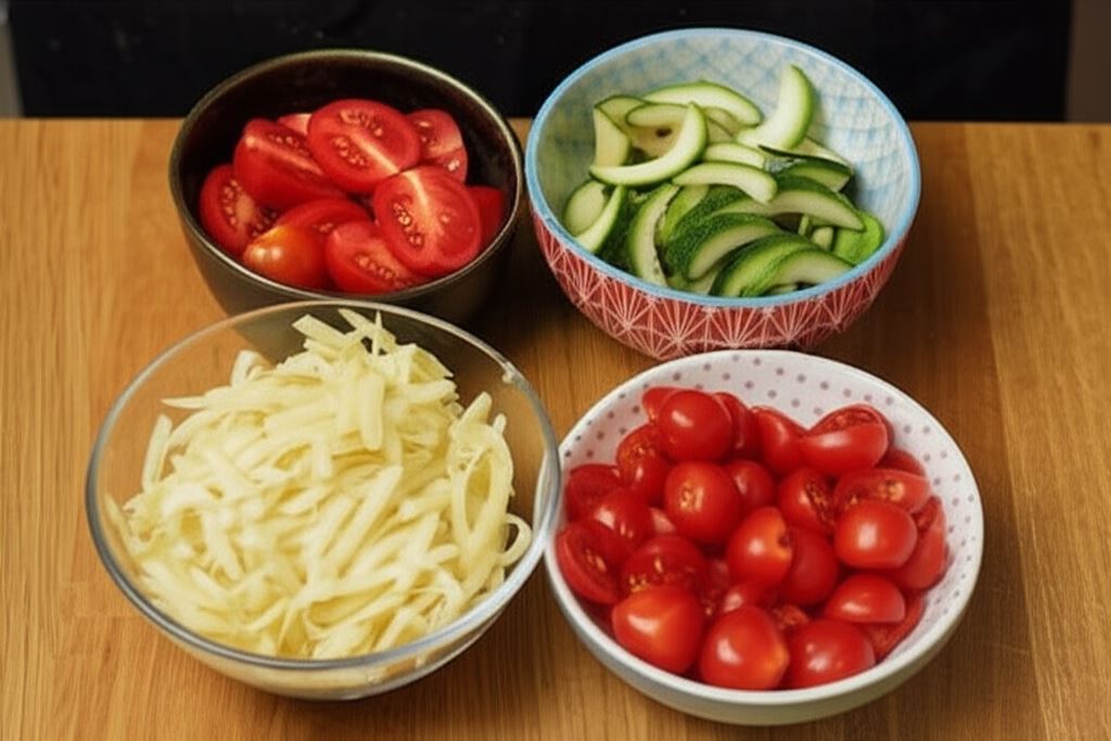 Cukinię pokrój na plastry, cebulę na półplastry, a pomidorki koktajlowe przetnij na połówki. Potem zetrzyj ser żółty.