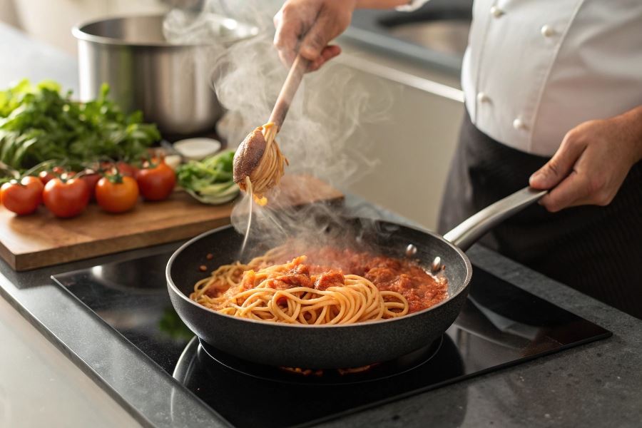 Metoda przygotowania spaghetti bezpośrednio w sosie na patelni stała się prawdziwym przełomem w kuchni 2025 roku. Kluczowym atutem tej techniki jest znacząca oszczędność czasu – makaron gotuje się bezpośrednio w sosie, eliminując potrzebę oddzielnego gotowania w wodzie. Badania kulinarne z początku 2025 roku wykazały, że technika ta pozwala zaoszczędzić średnio 15-20 minut podczas przygotowania posiłku.