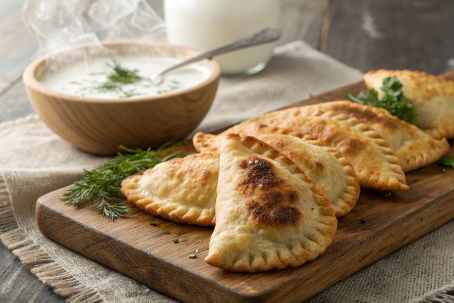 Leniwe czebureki na kefirze najlepiej smakują podane na gorąco, bezpośrednio po usmażeniu, gdy ciasto jest jeszcze chrupiące, a nadzienie soczyste.