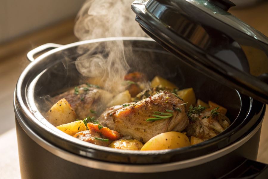Równomierne gotowanie – multicooker zapewnia jednakową temperaturę ze wszystkich stron, co eliminuje problem niedogotowanych lub przegotowanych fragmentów potrawy. Ziemniaki i mięso królika osiągają perfekcyjną konsystencję w tym samym czasie.