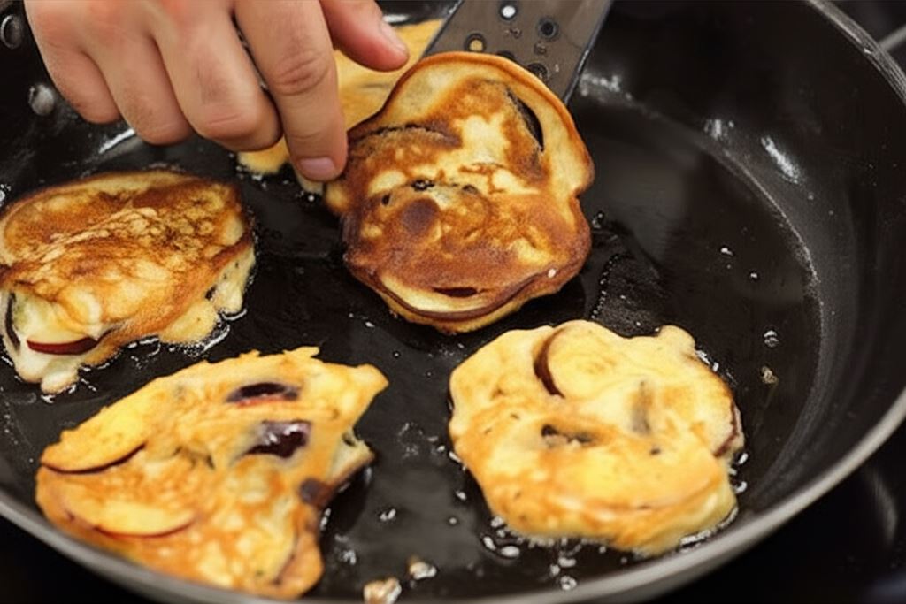 Rozgrzej olej na patelni. Powinien być ciepły, lecz nie gorący. Nakładaj łyżką ciasto ze śliwkami, formując okrągłe racuszki.