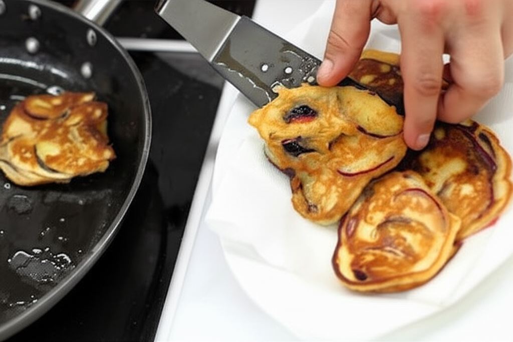 Osusz placki z nadmiaru oleju na papierowym ręczniku. Serwuj oprószone pudrem cukrowym.