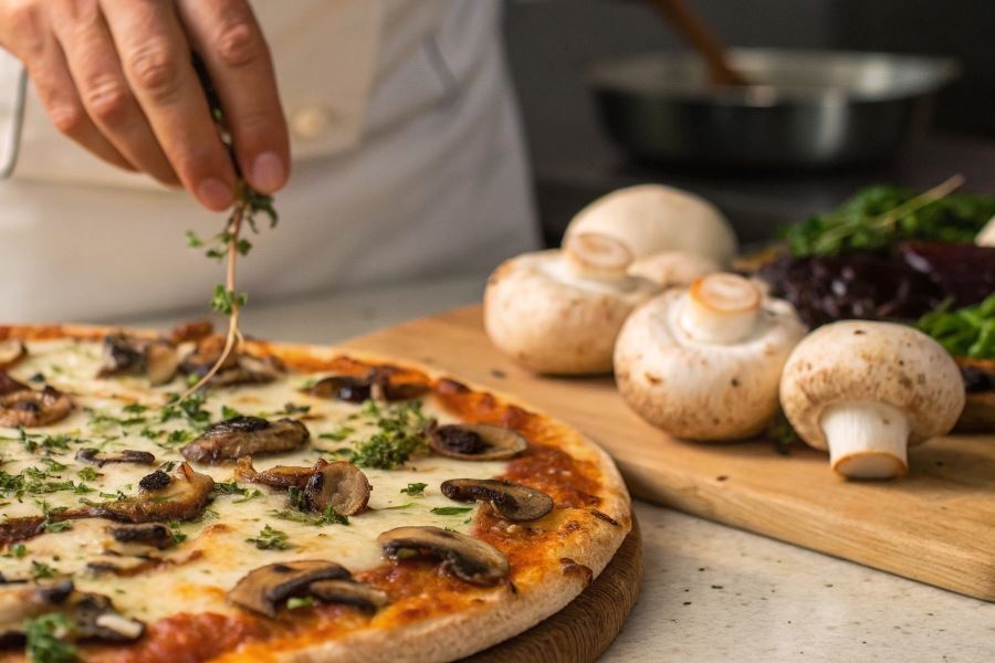 Sekret mistrzów pizzy: pieczarki najlepiej układać pod warstwą sera, co zapobiega ich wysuszeniu i pozwala zachować soczystość. Dla intensywniejszego aromatu, posyp pizzę przed podaniem świeżo zmielonym pieprzem i listkami świeżego tymianku.