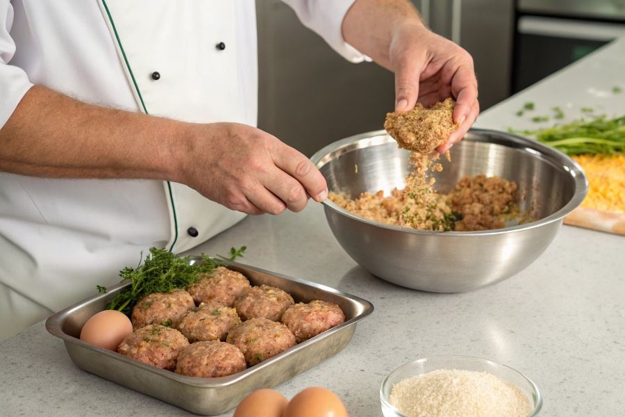 Przy formowaniu kotletów z problematycznej masy kluczowe jest zwilżanie dłoni zimną wodą przed każdym kotletem, co zapobiega przywieraniu mięsa do rąk i ułatwia nadawanie kształtu.
