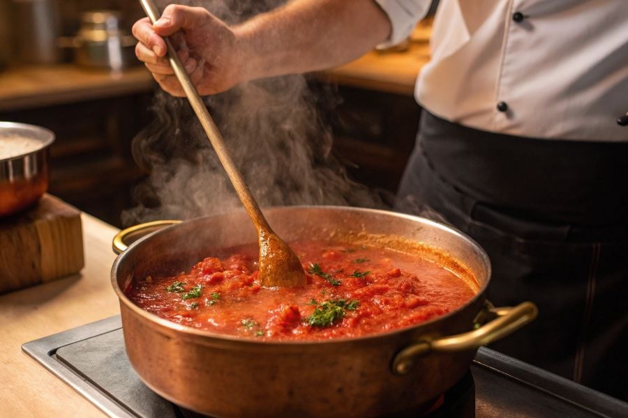 - Naturalne zagęszczenie – długie gotowanie na wolnym ogniu redukuje wodę i koncentruje smak