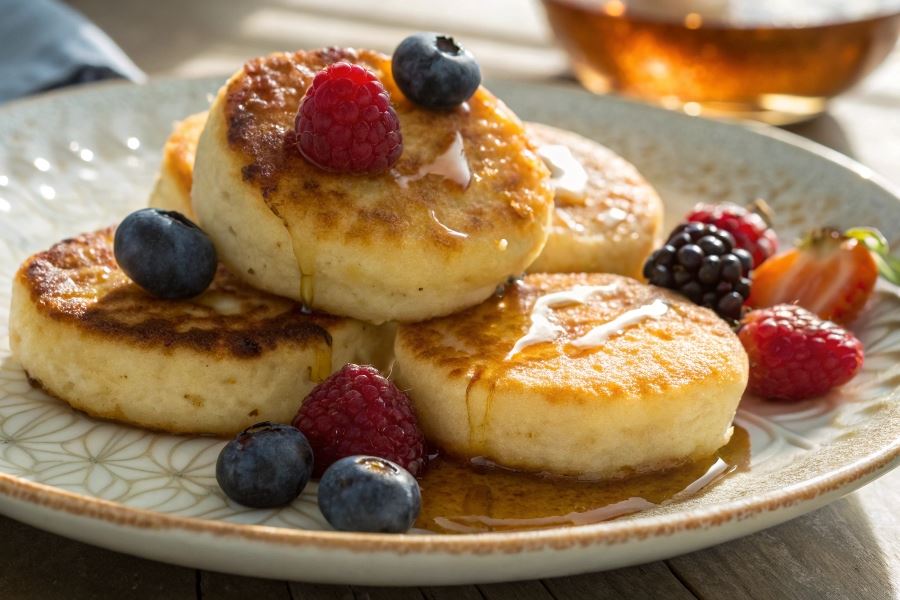 Dla nowoczesnej interpretacji warto serwować syrniki z jogurtem greckim i świeżymi owocami sezonowymi, co podkreśli ich lekkość i delikatność.