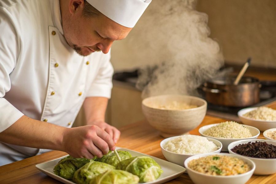 Technika podsmażania ryżu przed gotowaniem znacząco podnosi walory smakowe farszu. Wystarczy zeszklić ryż na maśle klarowanym przez 2-3 minuty, co nada mu orzechowego aromatu i sprawi, że ziarna pozostaną bardziej oddzielone w gotowym farszu. Ta metoda szczególnie dobrze sprawdza się z ryżem basmati i jaśminowym.