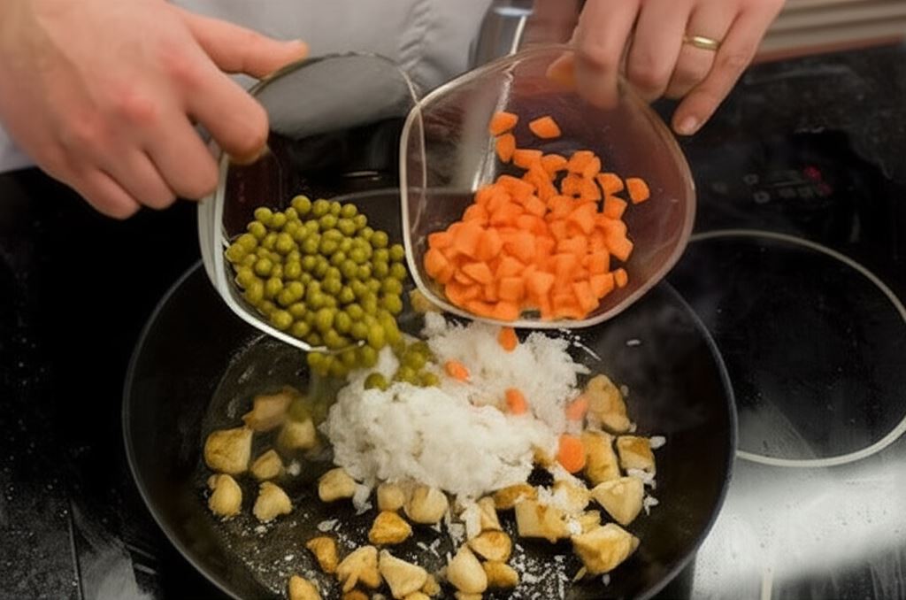Wsyp groszek z puszki i ryż.