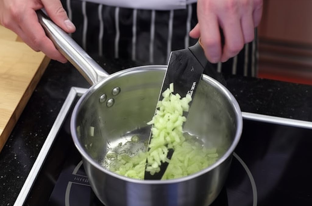 Na rozgrzanej patelni z olejem i margaryną zeszkl pokrojoną cebulę, czosnek i seler.
