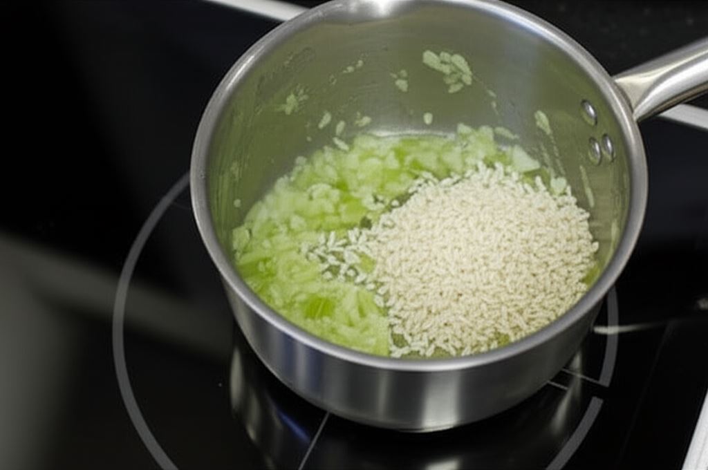 Gdy warzywa zmiękną, wsyp suchy ryż i mieszaj go na patelni przez minutę. Potem wlej wino i zaczekaj, aż odparuje.