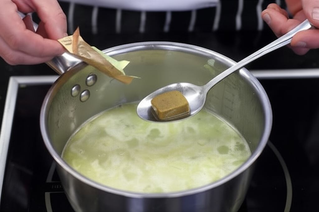 Teraz dolej 1 l wody i wrzuć kostkę Knorr. Wszystko starannie zamieszaj i gotuj przez około 15 minut na małym ogniu.