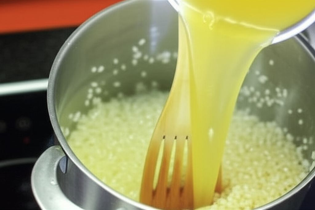 Na oliwie z oliwek zeszklij pokrojoną w kostkę cebulę, wsyp ryż. Całość smaż przez moment i zalej 600 mililitrami bulionu warzywnego. Gotuj powoli, aż ryż wchłonie cały bulion.