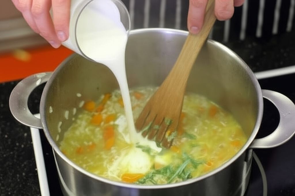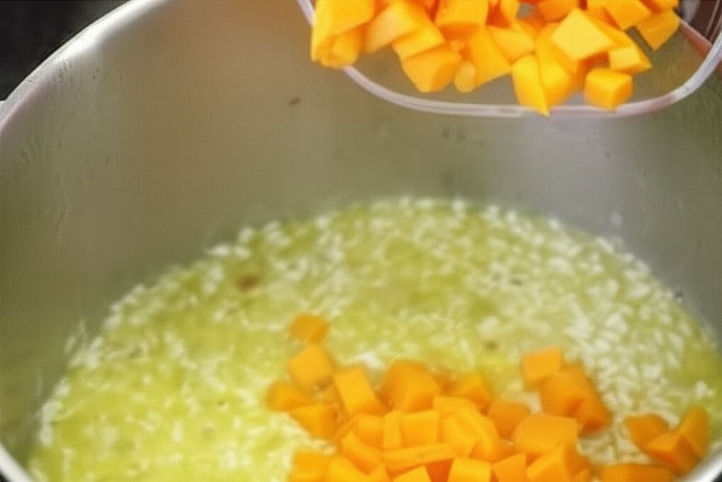 Wrzuć pokrojoną dynię i pozostałą część bulionu. Gotuj aż do momentu wchłonięcia bulionu.