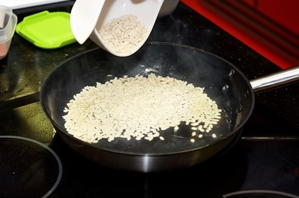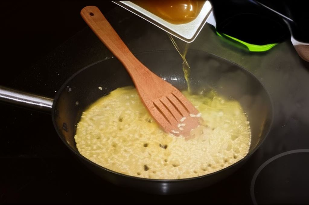 Smaż ryż w garnku na łyżce oleju, aż stanie się przezroczysty.