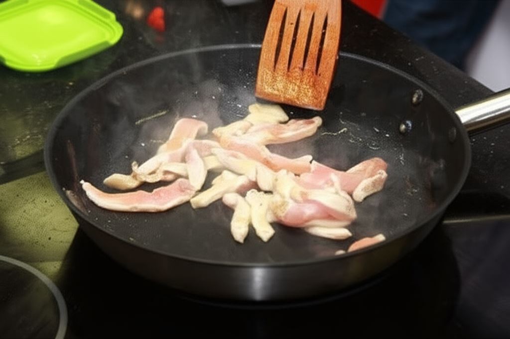 Podziel pierś kurczaka na paski. Przypraw solą, pieprzem i ostrą papryką. Potem obsmaż przez około 3 minuty.