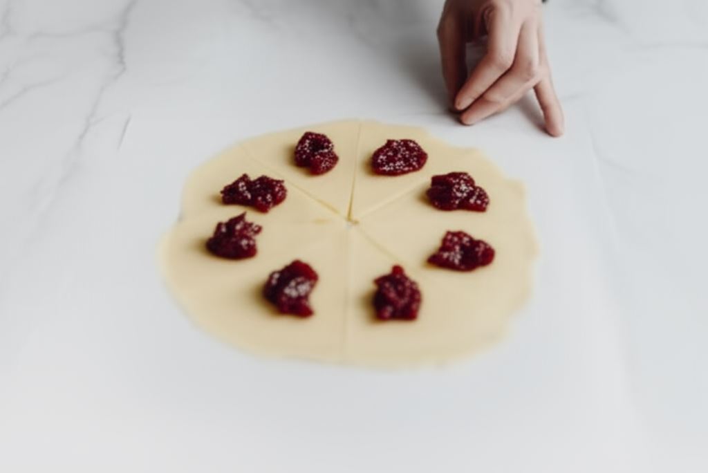 Każdy placek przy pomocy noża dzielimy na 8 części. Na środku umieszczamy po 1/2 łyżeczki konfitury.