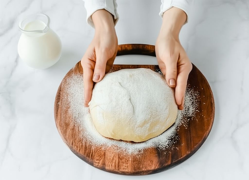 Mąkę przesiewamy do miski. Wsypujemy drożdże, dodajemy żółtka, ciepłe mleko, cukier, ziarna z laski wanilii, proszek do pieczenia, sól i roztopione masło. Wyrabiamy wszystko, dopóki nie uzyskamy gładkiego ciasta. Z ciasta formujemy kulę i oprószamy mąką. Odkładamy na 1 h w ciepłe miejsce do wyrośnięcia.