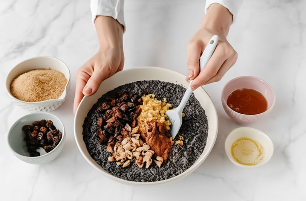 Makowe nadzienie można wzbogacić według własnych upodobań. Świetnie komponują się z nim orzechy laskowe, migdały, a także suszone owoce jak daktyle czy figi, które dodadzą wyrazistości i nowych nut smakowych.