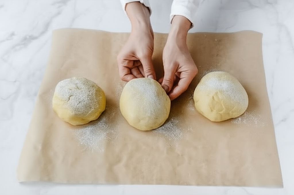 Ciasto rozdzielamy na trzy mniejsze porcje.