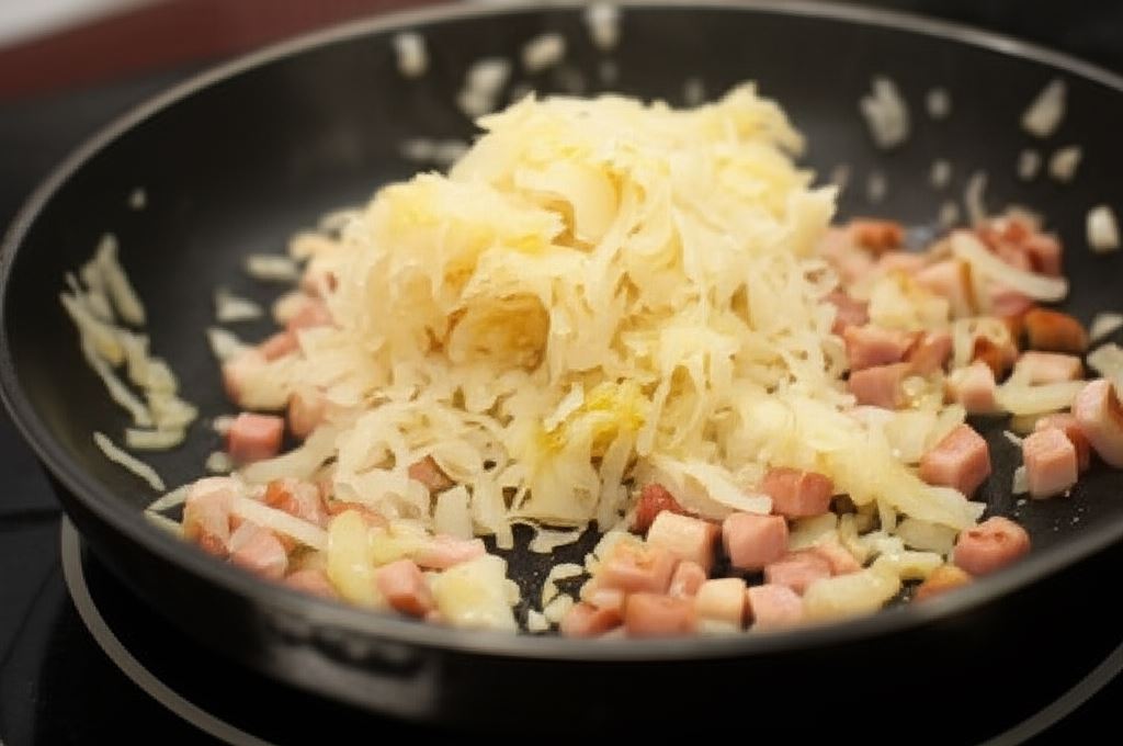 Cebulę i boczek pokrój w kostkę. Boczek zrumień na patelni, aby wytopić z niego tłuszcz, potem wsyp połowę cebuli. Po chwili dołóż odciśniętą kiszoną kapustę, mielony kminek, miód i majeranek. Całość zalej szklanką wody i gotuj, dopóki kapusta nie będzie miękka, a sos prawie całkowicie nie odparuje.