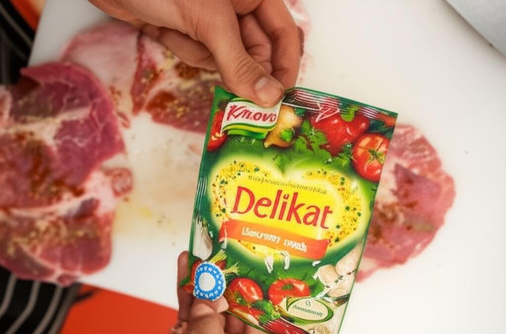 Mięso opłucz, oczyść z błonek i żyłek. Potnij na steki, które ubij tłuczkiem kuchennym przez folię spożywczą. Potem posyp je Delikatem Knorr, pieprzem i słodką papryką.