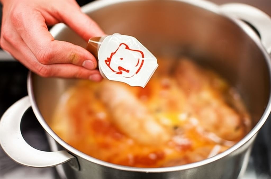 Usuń z wierzchu utworzoną pianę, wsyp przyprawy i Kostkę do mięs pieczeniową Knorr. Wszystko gotuj pod częściowo przykrytą pokrywką na małym ogniu, przez około 30 minut, aż mięso stanie się miękkie.