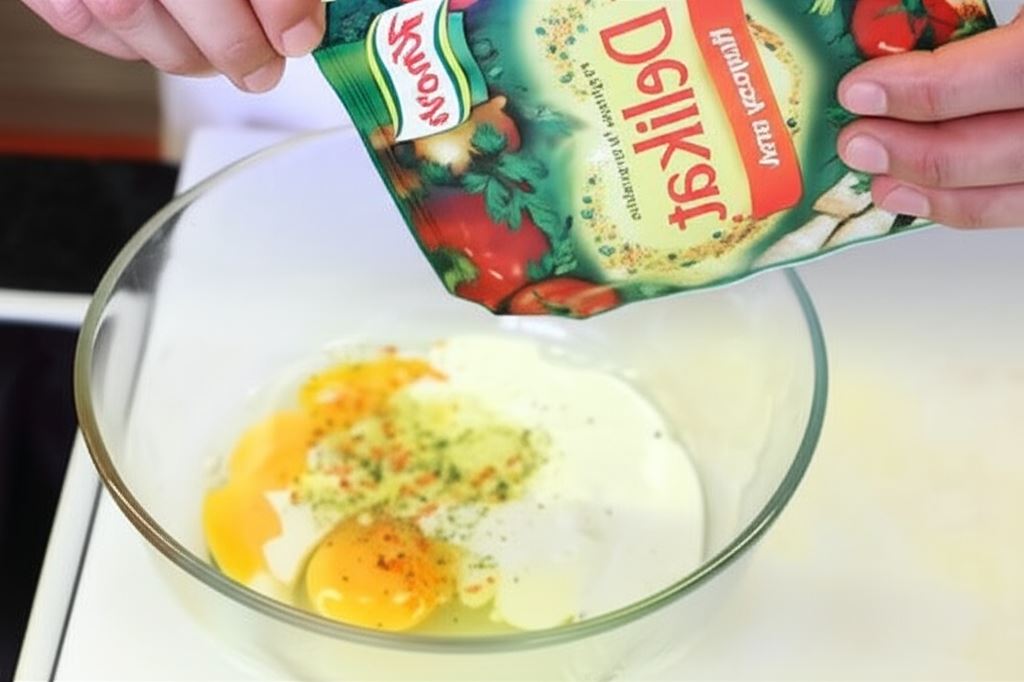 Roztrzep jajko, połącz ze śmietaną, dopraw pieprzem i przyprawą Knorr.