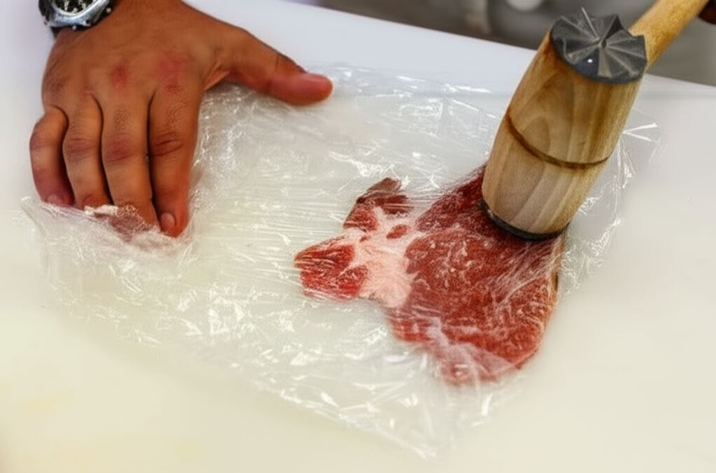 Potnij karkówkę na kotlety o grubości centymetra i roztłucz je tłuczkiem na dość cienkie plastry.