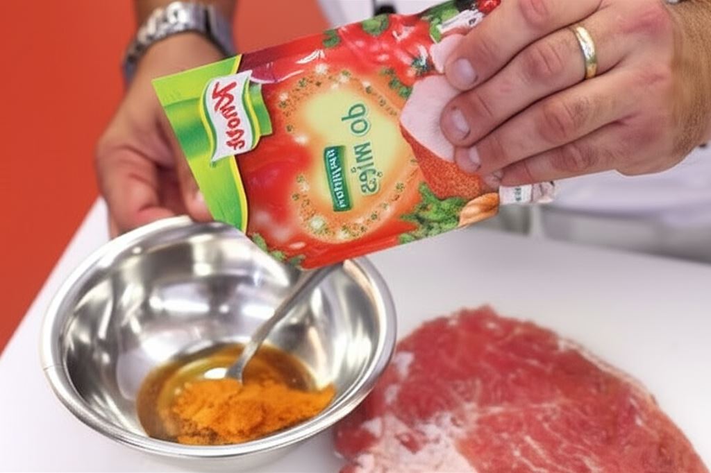 Sporządź marynatę z oliwy i Przyprawy do mięs Knorr. Natrzyj nią mięso i odłóż na 20 minut do chłodnego miejsca.