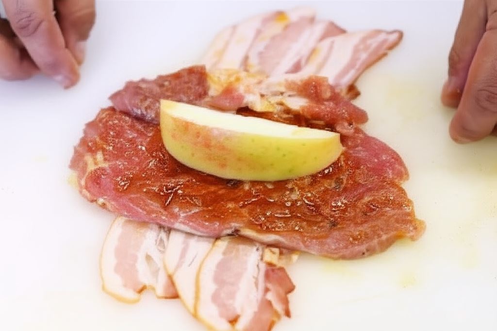 Umieść plaster mięsa na plastrze boczku, a na nich fragment jabłka, następnie całość zawiń w roladkę. Grilluj roladki przez około 15-20 minut z każdej strony. Serwuj.