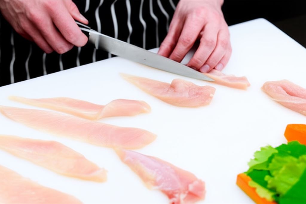 Rozpocznij od przygotowania mięsa. Każdą pierś przetnij wzdłuż na połowę, by uzyskać dwa cienkie i szerokie plastry. Potem każdy z nich przekrój jeszcze raz na pół, aby otrzymać długie paski.